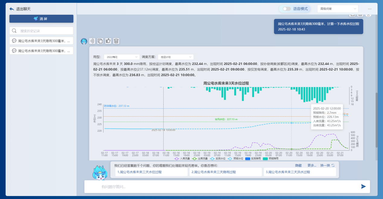 基于前端感知的降雨、水位、流量、工程運(yùn)行等實(shí)時(shí)信息,借助DeepSeek大模型和“甬水院智算”算法庫,能夠?qū)崟r(shí)對(duì)流域防汛形勢(shì)進(jìn)行快速分析,包括降雨形勢(shì)、水情預(yù)警、預(yù)泄分析、水庫納蓄分析等,可以按照規(guī)定的表單形式一鍵輸出成果,為防汛防洪工作提供兼具前瞻性、科學(xué)性、精準(zhǔn)性、安全性的決策支撐。相關(guān)學(xué)術(shù)成果曾以《基于大模型的水利防汛智能問答關(guān)鍵技術(shù)研究與應(yīng)用探索》為題于去年8月的第七屆城市水安全與水管理學(xué)術(shù)交流會(huì)作專題匯報(bào)。