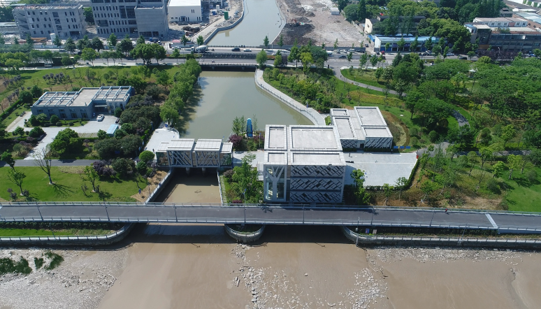工程通過(guò)抽象手法,將樹(shù)、落葉等元素融入到建筑表情之中,從而閘站更像是沿江公園里面的雕塑,通過(guò)虛實(shí)的結(jié)構(gòu)處理,弱化了高大廠房結(jié)構(gòu)的厚重感。