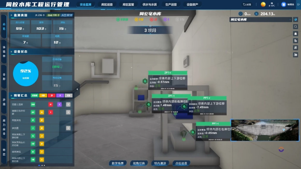 水庫大壩是流域防洪工程體系重要組成部分,是保障水安全的“重器”。數(shù)字孿生周公宅-皎口梯級水庫系統(tǒng)利用高精度模擬仿真引擎1:1構(gòu)建水庫大壩可視化模型和工程安全監(jiān)測分析模型,全面監(jiān)控、深入分析水庫環(huán)境量、變形、滲流、應(yīng)力應(yīng)變、地震等安全要素,逐時分析大壩的各項安全指標,直觀展示大壩的安全狀態(tài)。