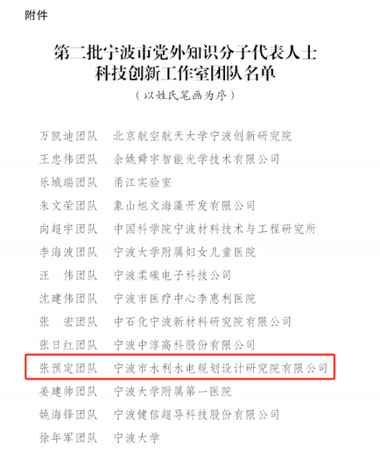 張預定創(chuàng)新工作室榮獲“寧波市黨外知識分子科技創(chuàng)新工作室”授牌,是對我院在水利領域深耕創(chuàng)績的肯定和認可,也對我院將來的工作推進提出了更高的標準和要求。為此,我院將以此為契機,積極發(fā)揮榜樣團隊的示范引領作用,進一步激勵和支持廣大員工立足崗位、投身科技創(chuàng)新,以實干思維緊扣謀事成事的主旋律,以鉆研精神夯實攻堅克難的基本功,力求在新質生產(chǎn)力培育發(fā)展上再創(chuàng)佳績,為寧波水利高質量發(fā)展作出新貢獻。