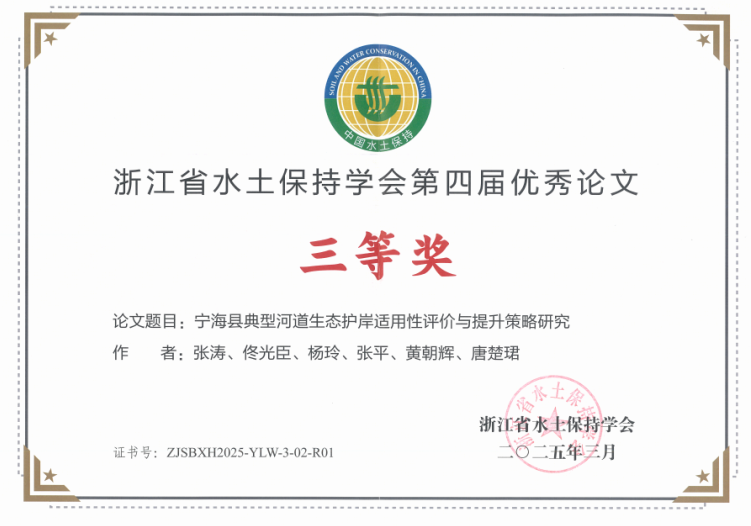 會議現(xiàn)場通報了2024年度生產(chǎn)建設(shè)項目水土保持方案優(yōu)秀單位、2024年度生產(chǎn)建設(shè)項目水土保持監(jiān)測優(yōu)秀單位,并為獲獎集體進(jìn)行表彰。隨后,又現(xiàn)場表彰了浙江省水土保持學(xué)會第四屆優(yōu)秀論文評選結(jié)果。我院榮獲2024年度生產(chǎn)建設(shè)項目水土保持方案優(yōu)秀單位、2024年度生產(chǎn)建設(shè)項目水土保持監(jiān)測優(yōu)秀單位兩項集體榮譽(yù),并且以論文《寧海縣典型河道生態(tài)護(hù)岸適用性評價與提升策略研究》獲得浙江省水土保持學(xué)會第四屆優(yōu)秀論文三等獎。