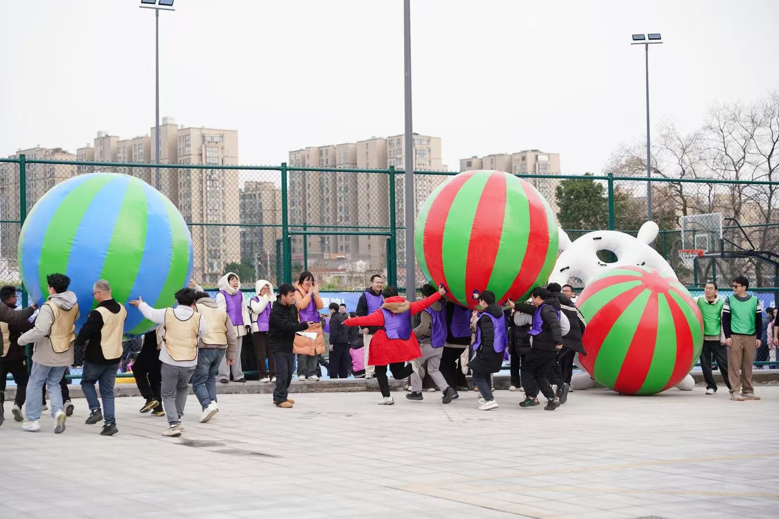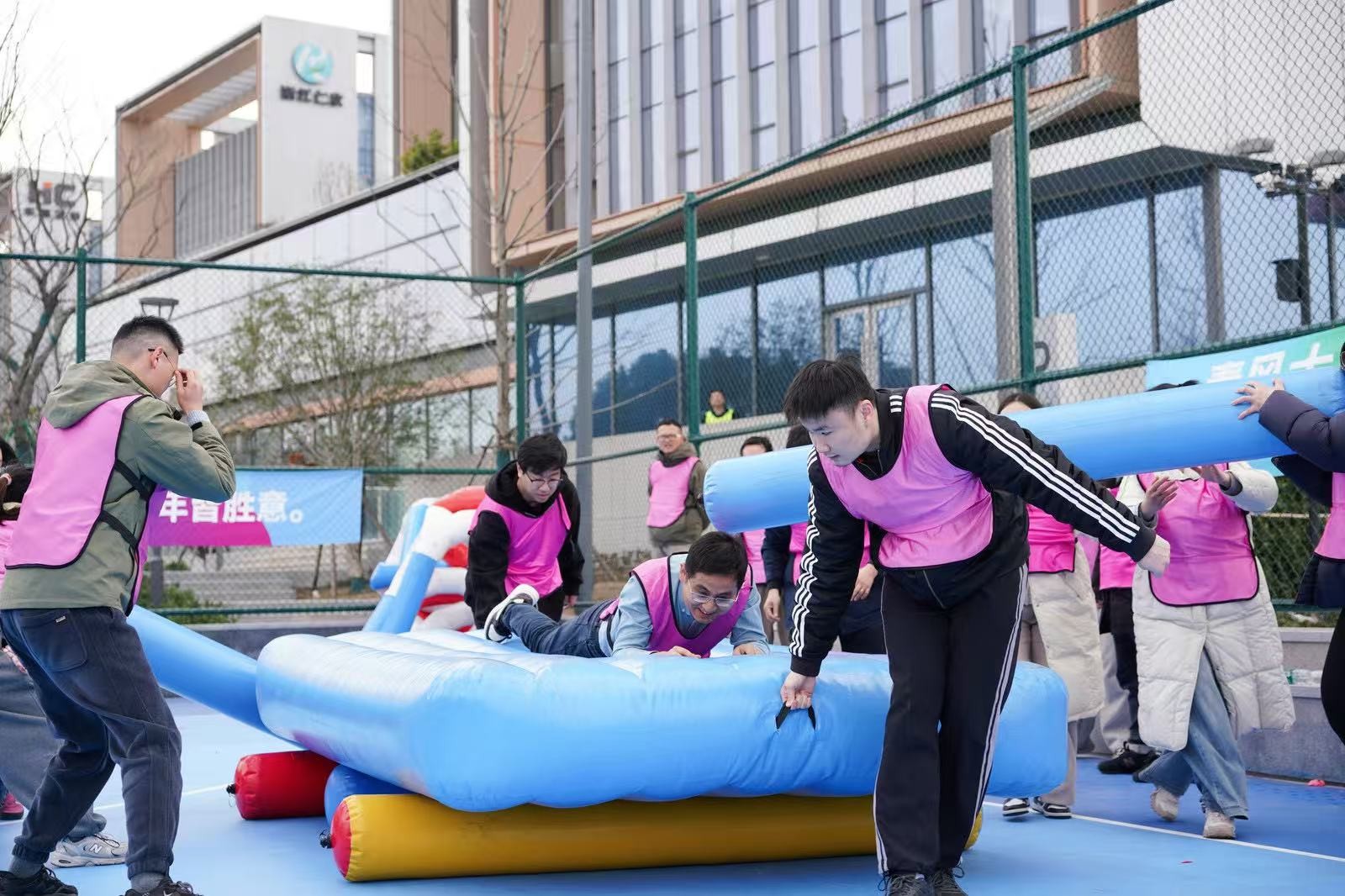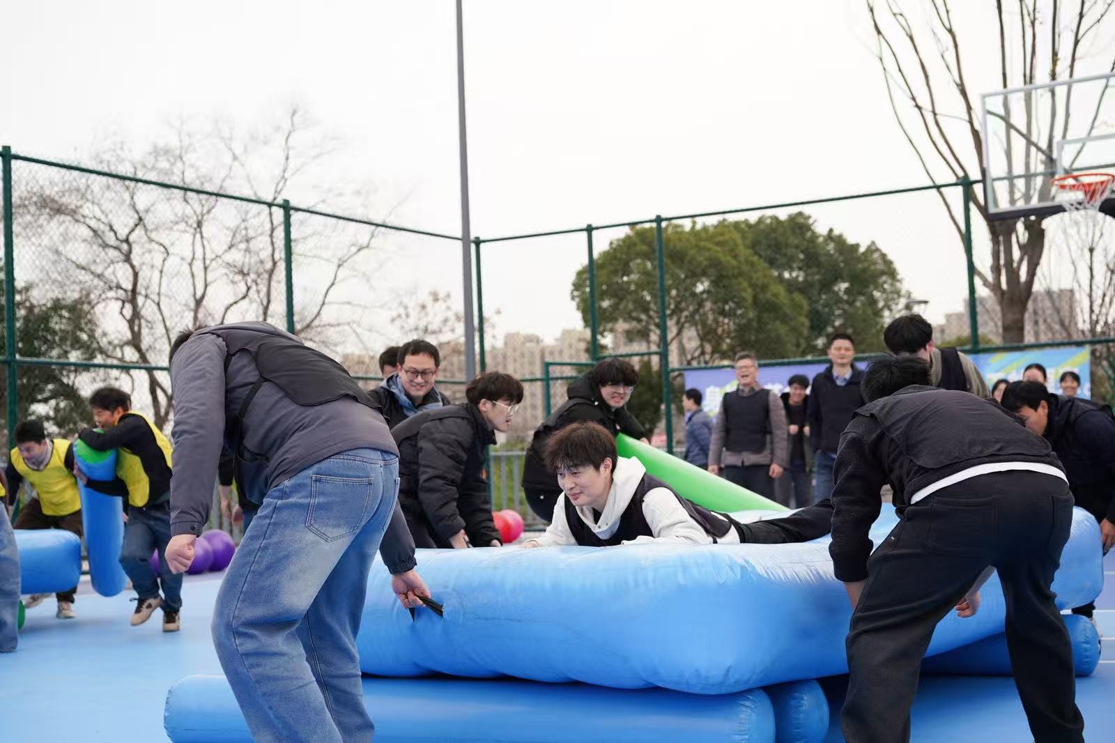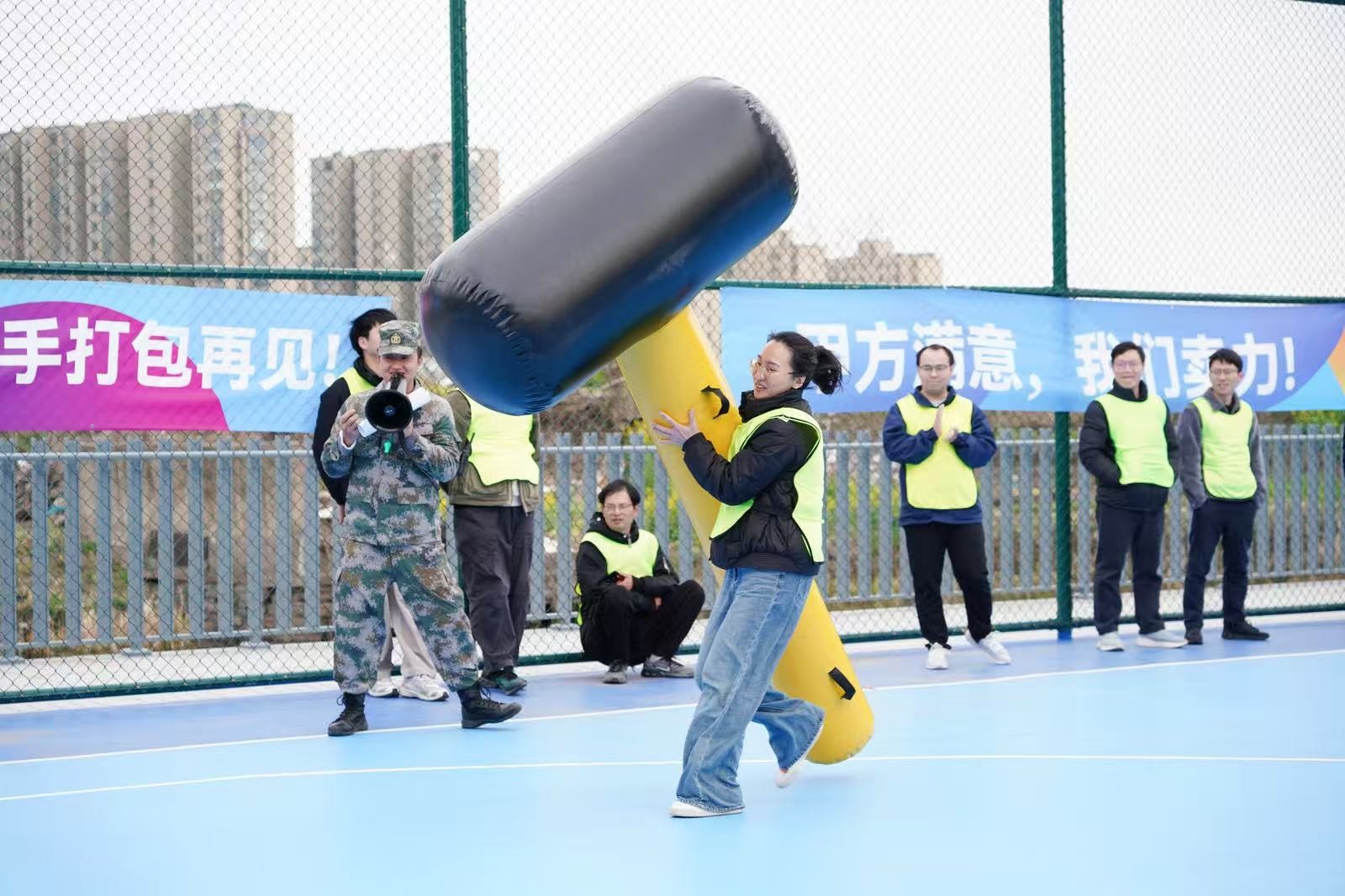 “勇立潮頭”考驗的是反應(yīng)與穩(wěn)定,隊員們圍成圓圈快速移動,同步接住充氣柱,1分鐘內(nèi)有效移動次數(shù)不斷刷新。“超級NBA”中,大家用瑜伽球投籃,雖姿勢各異,但進(jìn)球瞬間的歡呼同樣熱烈。“乘風(fēng)破浪”要求隊員在充氣墊上接力鋪設(shè)充氣棒,讓體重不輕于75kg的“重量級”選手穩(wěn)坐墊上,隊友們默契配合,如乘風(fēng)破浪般前行。最后的“巨人腳步”由每隊兩名領(lǐng)隊腳穿巨型鞋蹼接力奔跑,滑稽的動作引來全場笑聲不斷。