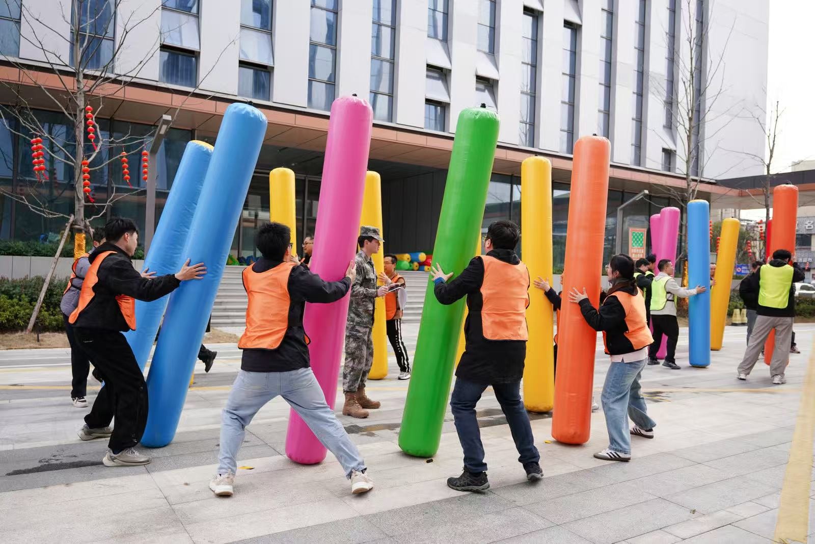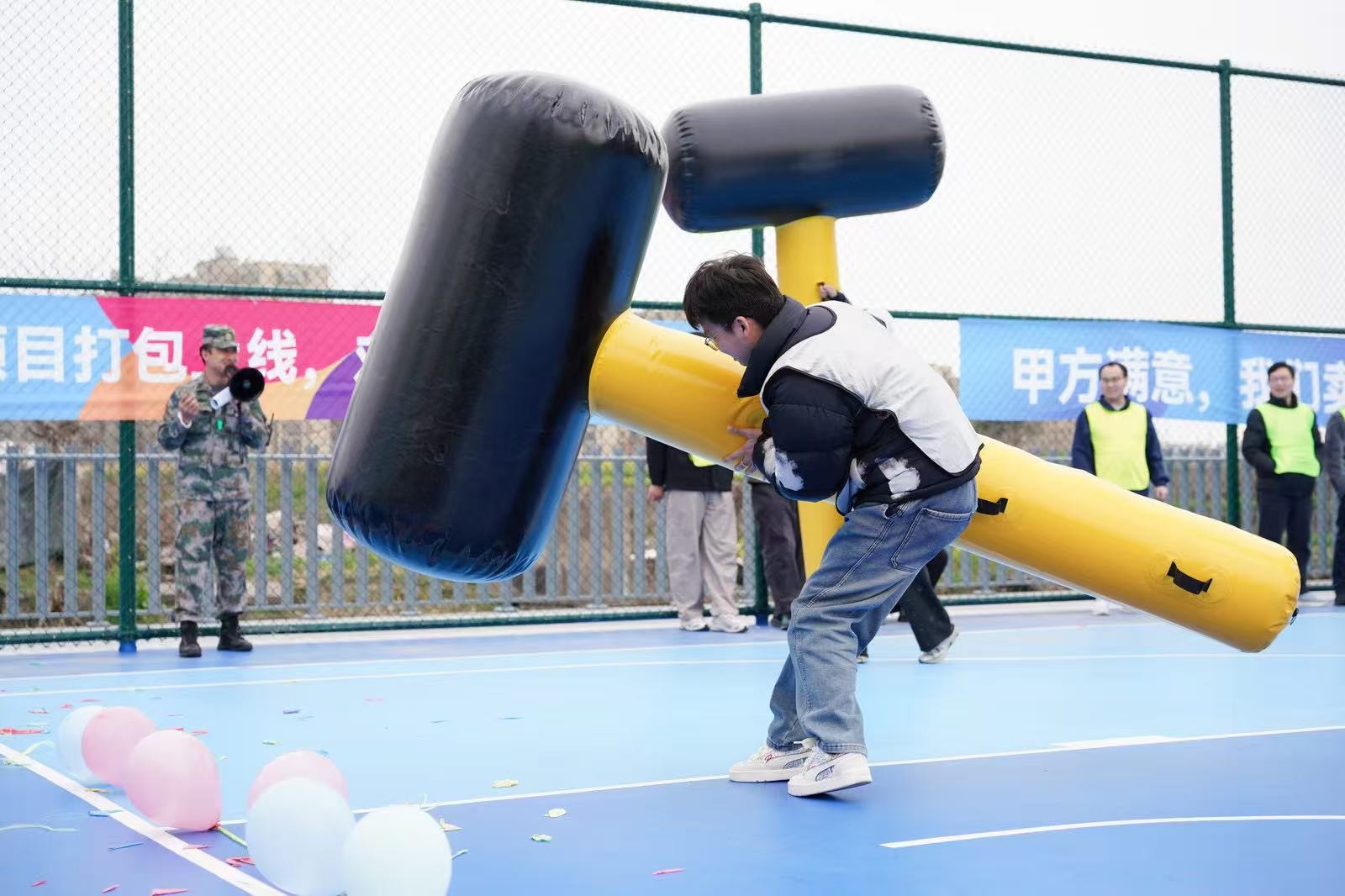 在“南水北調(diào)”項目中,隊員們手持PVC管接力運(yùn)水,5分鐘內(nèi)爭分奪秒,讓水流在管中傳遞涌向重點(diǎn),仿佛將團(tuán)隊的信任與責(zé)任匯聚成河。“龜兔賽跑”則讓隊員們化身可愛的“烏龜”和“兔子”,在賽道上你追我趕,妙趣橫生。“鴻運(yùn)亨通”需要8人共同托舉大球折返跑,大家步調(diào)一致,齊頭并進(jìn)。“一錘定音”環(huán)節(jié),隊員們揮動充氣大錘敲破氣球,每一聲“砰”響都引來陣陣喝彩。