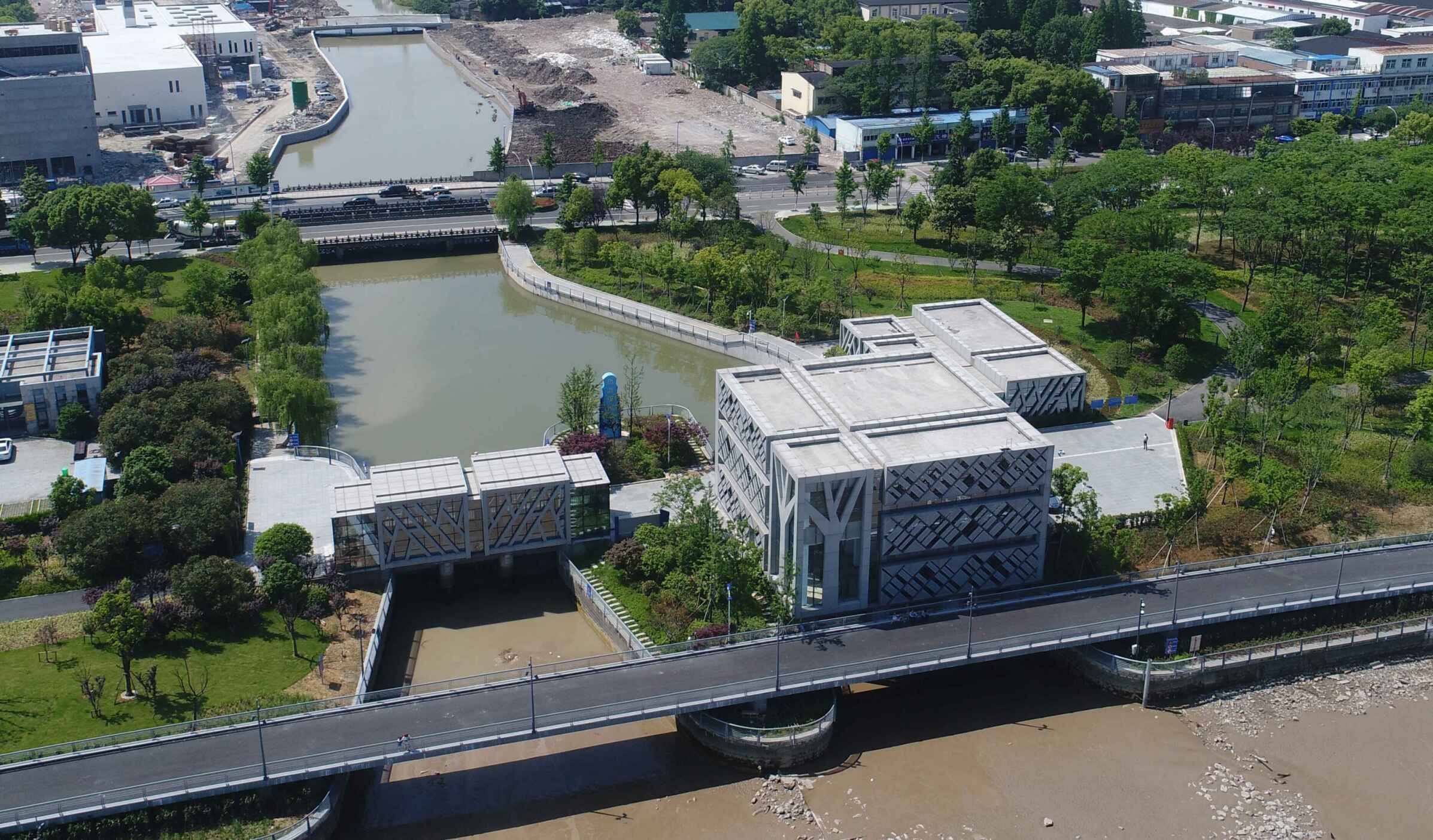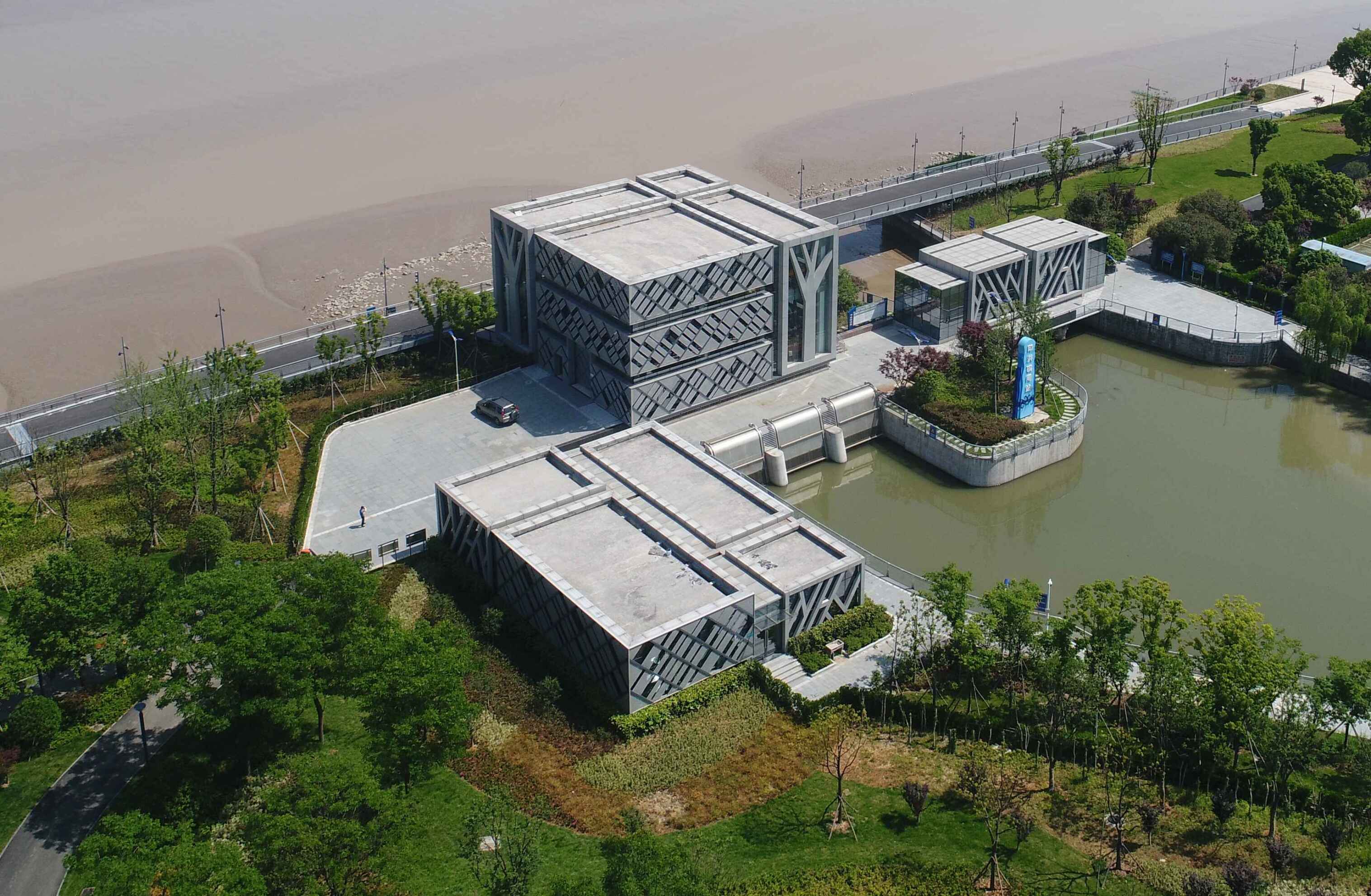 工程通過(guò)抽象手法,將樹(shù)、落葉等元素融入到建筑表情之中,從而閘站更像是沿江公園里面的雕塑,通過(guò)虛實(shí)的結(jié)構(gòu)處理,弱化了高大廠房結(jié)構(gòu)的厚重感。