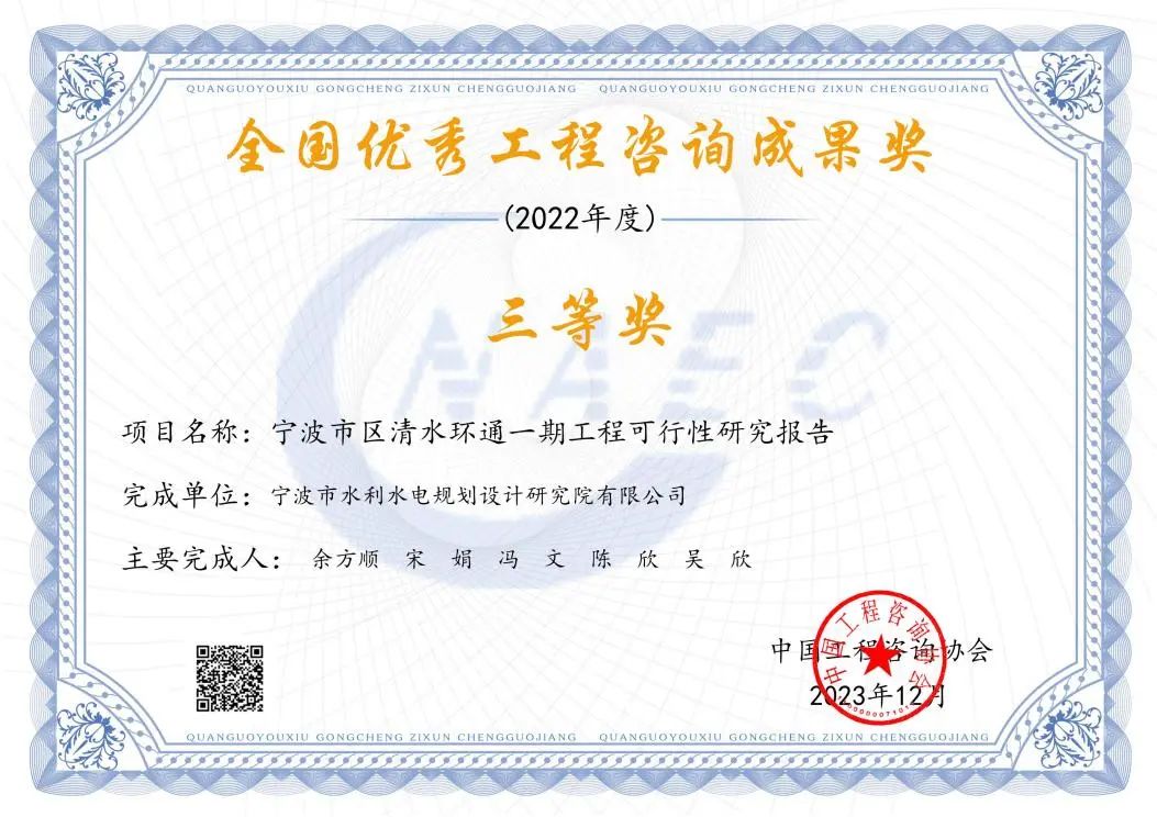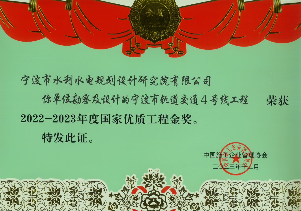 2023年我院多個項目在各類評比中脫穎而出,榮獲中國水利工程優(yōu)質(zhì)(大禹)獎、國家優(yōu)質(zhì)工程金獎、全國優(yōu)秀工程咨詢成果三等獎、浙江省水利科技創(chuàng)新獎、浙江省水土保持學會第三屆優(yōu)秀設計三等獎、“浙江省文明標化工地”稱號、2023 年度寧波市建設工程優(yōu)秀勘察設計獎、2023年度寧波市“甬江建設杯”優(yōu)質(zhì)工程獎、寧波市水利科技創(chuàng)新獎、寧波市水利學會優(yōu)秀論文獎等各類榮譽20余項。