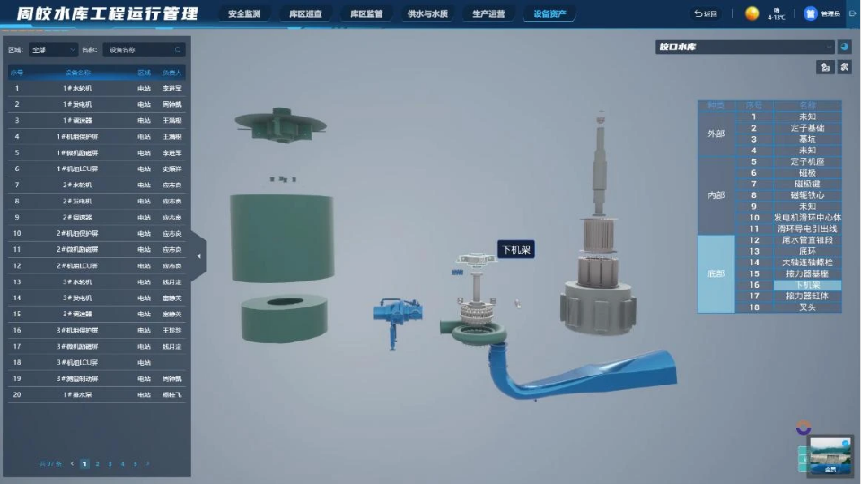 依托BIM仿真建模技術(shù),數(shù)字孿生周公宅-皎口梯級水庫系統(tǒng)實現(xiàn)了對水庫重要設(shè)備資產(chǎn)的精細管理。結(jié)合監(jiān)測監(jiān)控數(shù)據(jù),實時掌握水庫防洪、供水、發(fā)電的運行狀況,保障水庫安全高效運行。同時,利用BIM技術(shù)對水輪機、發(fā)電機等重要機電設(shè)備進行零部件級的拆解,“再現(xiàn)”設(shè)備的內(nèi)部機構(gòu)和狀態(tài)。這一技術(shù)幫助水庫工作人員直觀、深入地了解設(shè)備的運行原理與機制,為設(shè)備的精細管理及維修養(yǎng)護提供重要支持,也大幅提升了水庫設(shè)備管理的智能化水平。